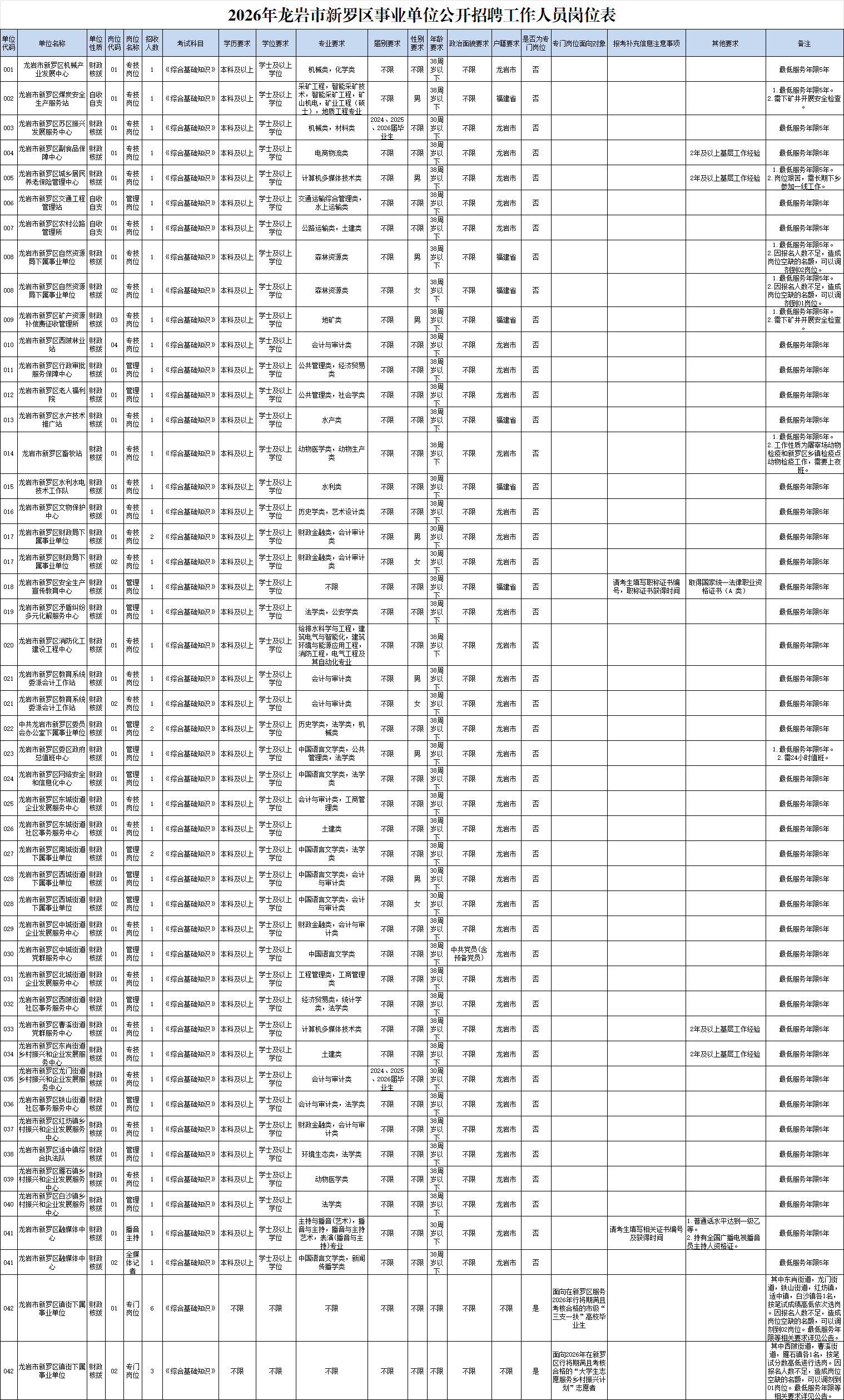 1.2026年龙岩市新罗区事业单位公开招聘工作人员岗位表
