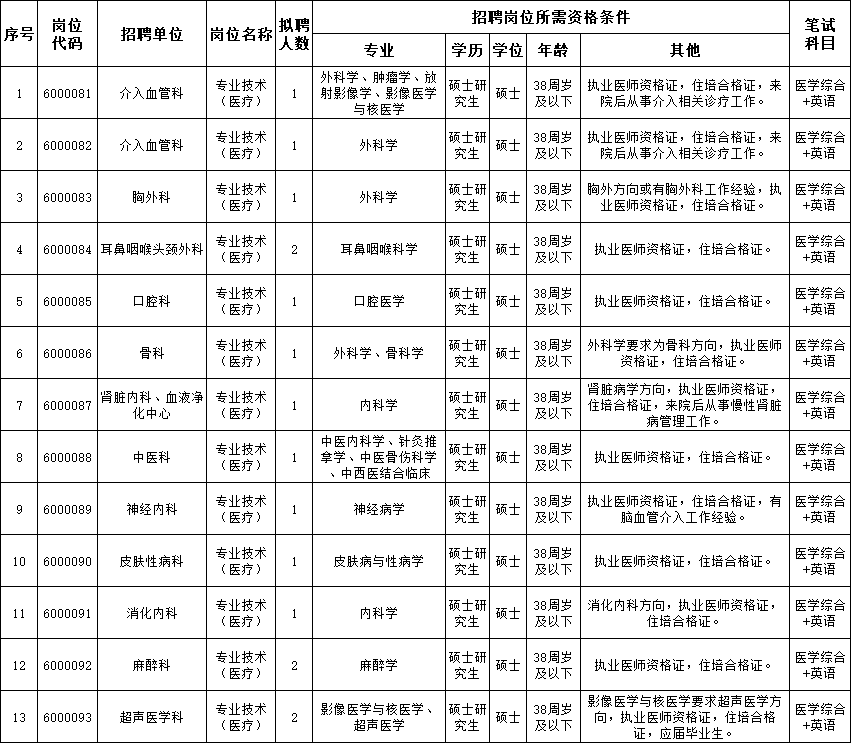 岗位具体条件:详见招聘计划中各岗位要求,报考有完成住院医师规范化培训要求的岗位,报到时需提供住院医师规范化培训合格证书,若为2026年完成住院医师规范化培训,尚未取得合格证书的,需提供官方渠道证明的2026年住院医师规范化培训结业考核合格材料,当年12月31日前必须取得住院医师规范化培训合格证书。