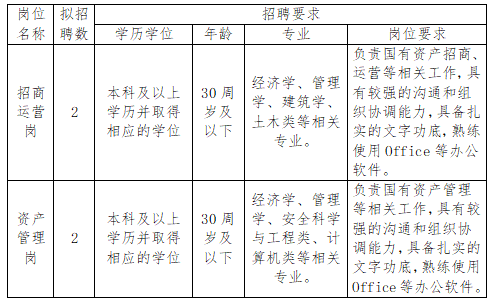 为满足公司发展需要,加强人才梯队建设,现面向优秀应届毕业生招聘2个岗位共4名员工,其中招商运营岗2名、资产管理岗2名。有关事项公告如下: